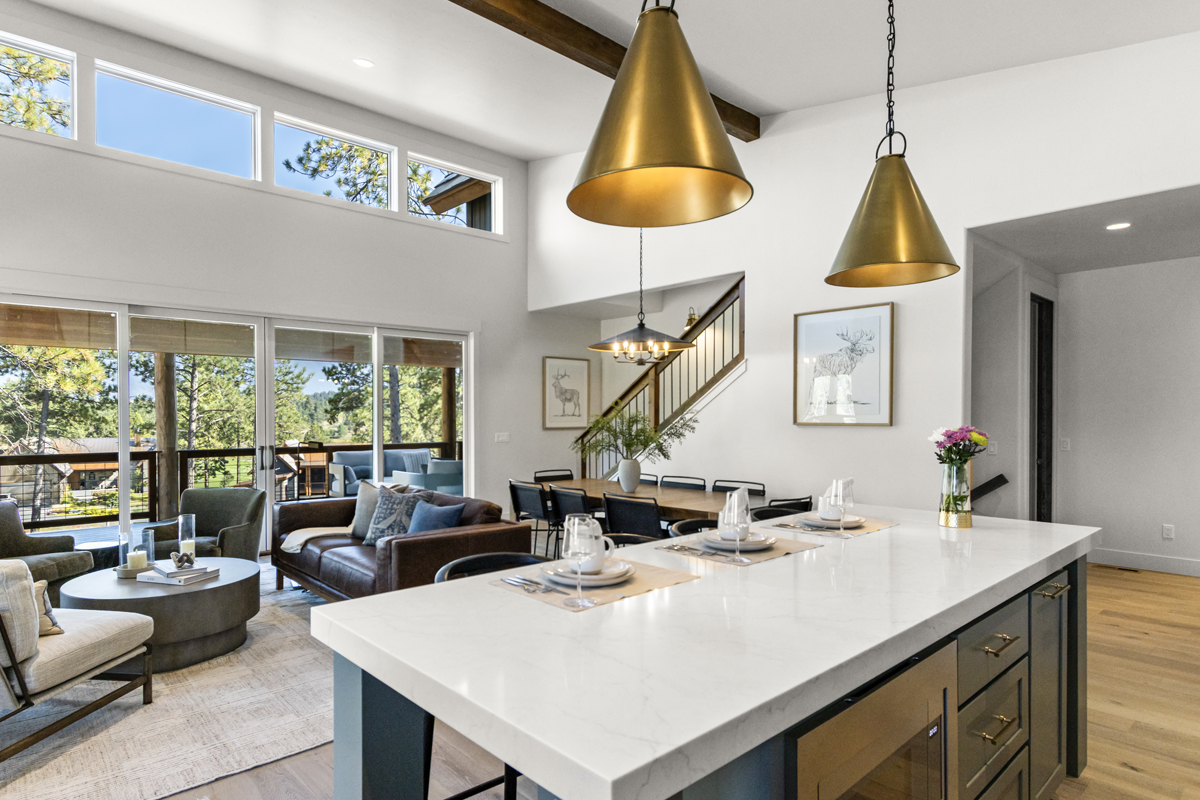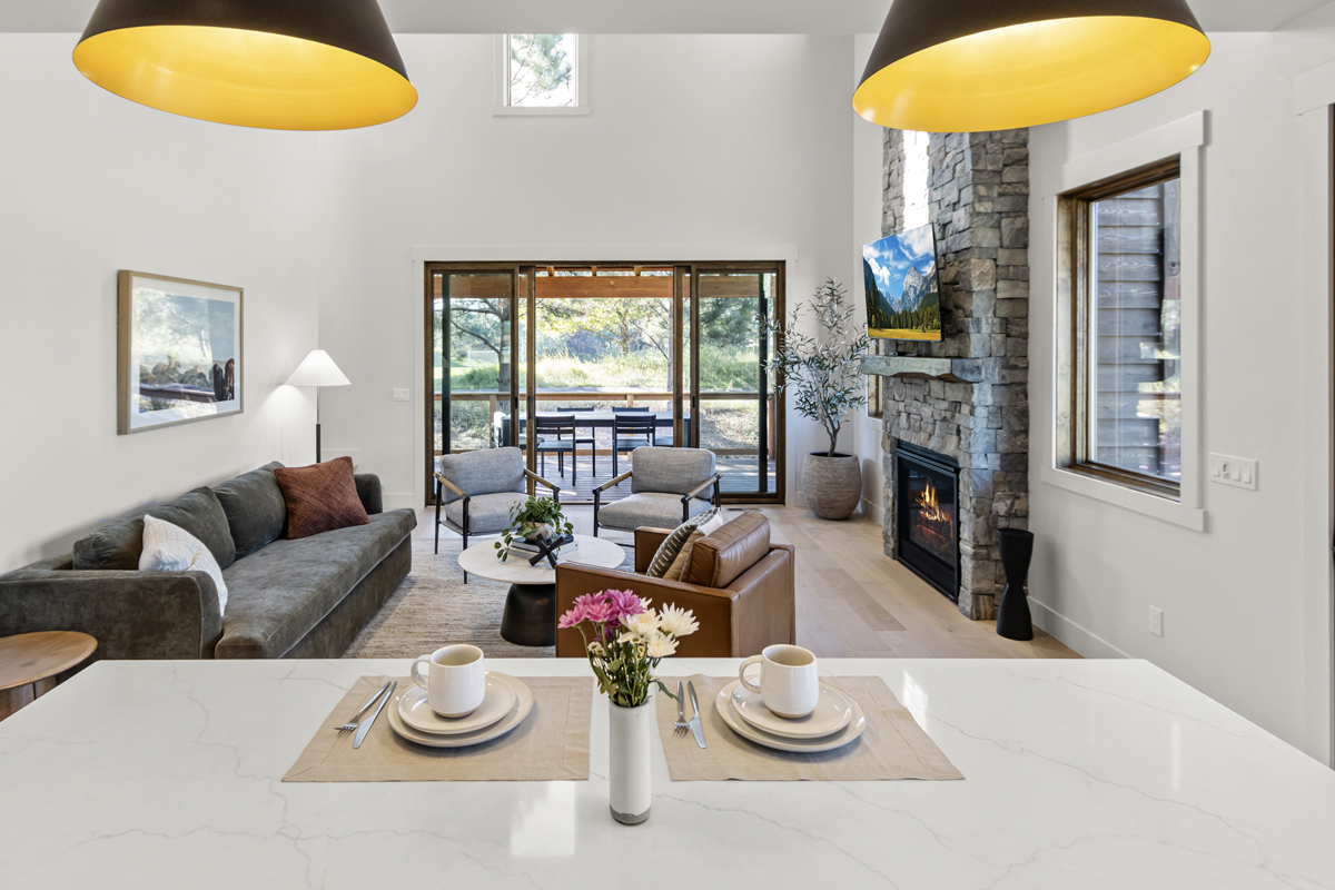 The White Pine is the Wilderness Club’s ideal 4-bedroom vacation home floor plan designed to optimize occupancy and efficiency. Featuring a wide-open great room complete with a stone-faced wood-burning fireplace and 16ft of sliding glass doors across the entire back wall, nature seems to walk right inside the house. The kitchen is galley-styled and comes with an island that doubles as the eating bar, sink, and storage space.